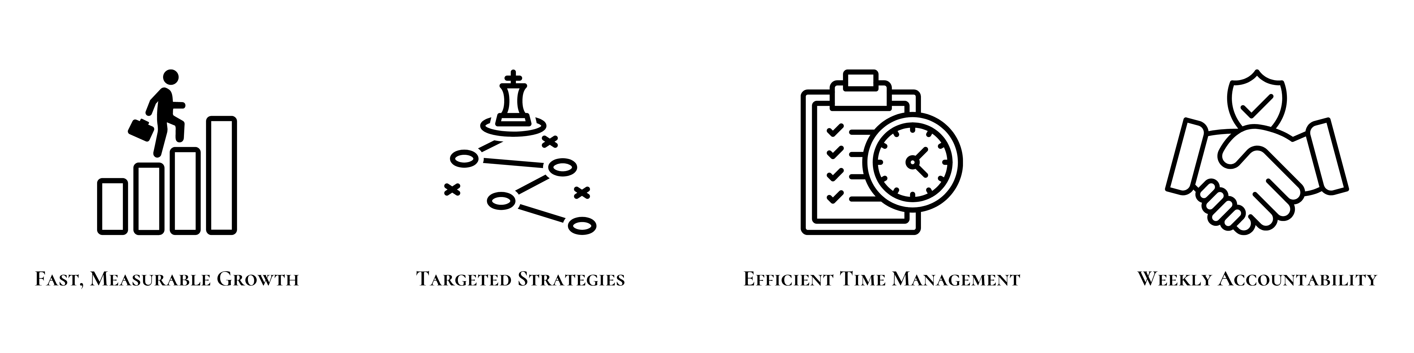 I challenge you to think differently, plan differently, and exceed your own expectations, dreams, and desires. My approach is designed not just to improve your performance but to revolutionize how you approach your business and your life. Together, we’ll focus on: